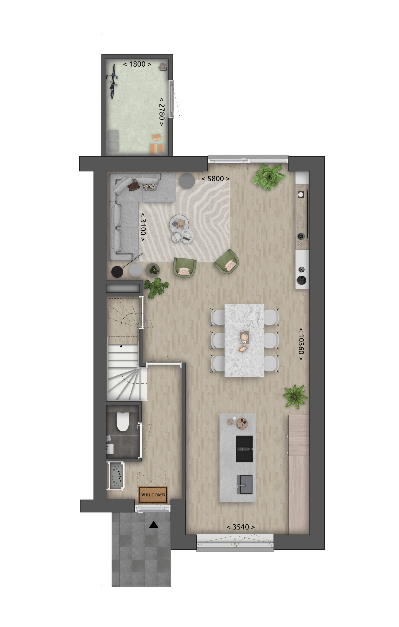 grond vind je de open keuken en woonkamer. Op de eerste verdieping tref je drie slaapkamers en een moderne badkamer. De zolder kun je volledig